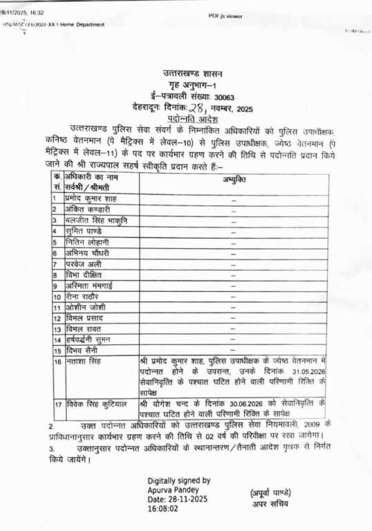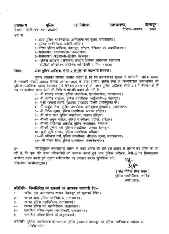 देहरादून। उत्तराखंड पुलिस महकमे में बड़ा प्रशासनिक फेरबदल किया गया है। विभाग ने आधा दर्जन से अधिक पुलिस क्षेत्राधिकारियों (CO) को नई और महत्वपूर्ण जिम्मेदारियाँ सौंपी हैं। प्रमोद शाह, शांतनु पाराशर सहित कई अधिकारियों को अपर पुलिस अधीक्षक (Additional SP) के पद पर तैनाती मिली है।