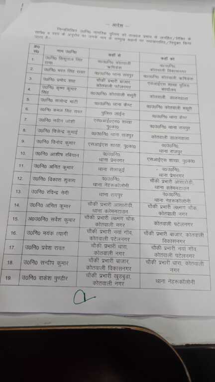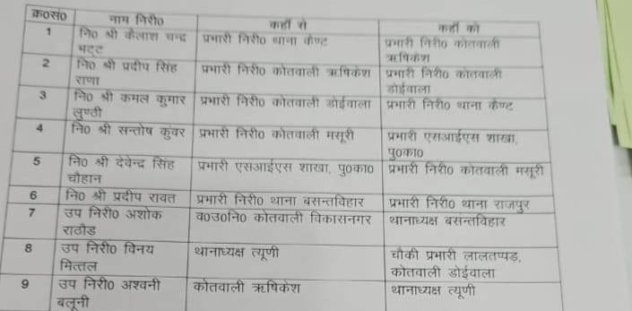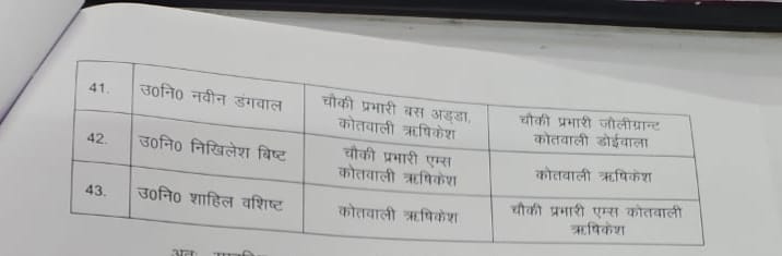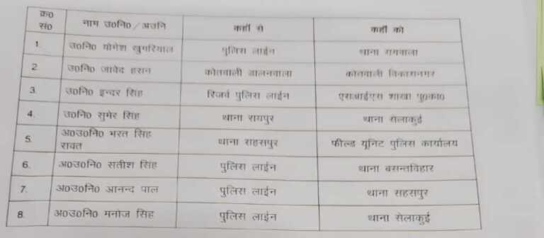 Share now*दिनांक 5/10/2025 को वरिष्ठ पुलिस अधीक्षक देहरादून द्वारा निम्न निरीक्षकों/उप निरीक्षकों के स्थानांतरण उनके नाम के सम्मुख अंकित स्थानों पर किये गए।* Tags: bumper transfers Dehradun SSP made Post navigation Previous उत्तराखंड में कोल्ड्रिफ-डेक्सट्रोमेथॉर्फन हाइड्रोब्रोमाइड सिरप पर बैन, 28 सैंपल जांच के लिए भेजेNext सी.एल.एफ. के लिए 1.20 करोड़ की 12 आर्थिक गतिविधियों का मुख्यमंत्री धामी ने किया लोकार्पण Leave a Reply Cancel replyYour email address will not be published. Required fields are marked *Comment * Name * Email * Website Save my name, email, and website in this browser for the next time I comment. More Stories उत्तराखण्ड नगर निगम में चोरी की कोशिश — छत तोड़कर घुसा चोर, वारदात सीसीटीवी में कैद October 14, 2025 dehradunplus उत्तराखण्ड सर्किल बार में आग के बाद डीएम की सख्ती — 15 दिन के लिए लाइसेंस निलंबित October 14, 2025 dehradunplus उत्तराखण्ड एसडीआरएफ में शुरू हुई युवा आपदा मित्र योजना October 14, 2025 dehradunplus