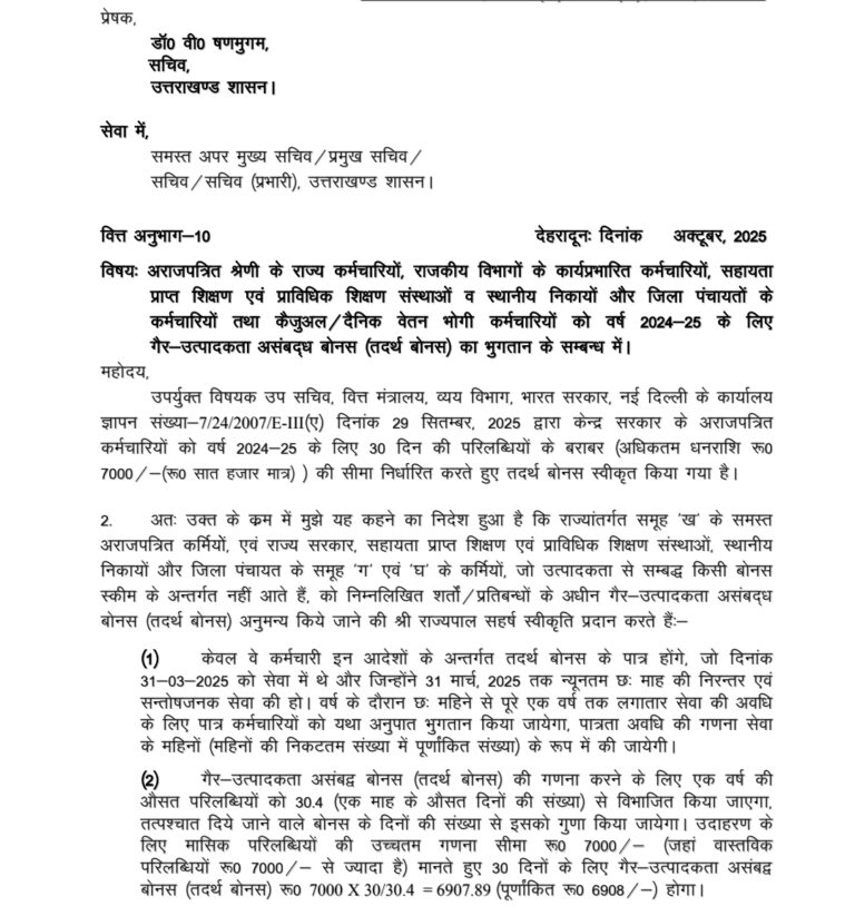 यह आदेश सभी अपर मुख्य सचिवों, प्रमुख सचिवों, सचिवों, जिलाधिकारियों और विभागाध्यक्षों को प्रेषित किया गया है ताकि पात्र कर्मचारियों को समय पर भुगतान सुनिश्चित किया जा सके। अंत में, राज्य सरकार ने यह निर्णय ऐसे समय में लिया है जब दीपावली से पूर्व कर्मचारियों को वित्तीय राहत की आवश्यकता होती है। यह बोनस न केवल सरकारी तंत्र में उत्साह बढ़ाएगा, बल्कि अर्थव्यवस्था में भी उपभोग को प्रोत्साहित करेगा।