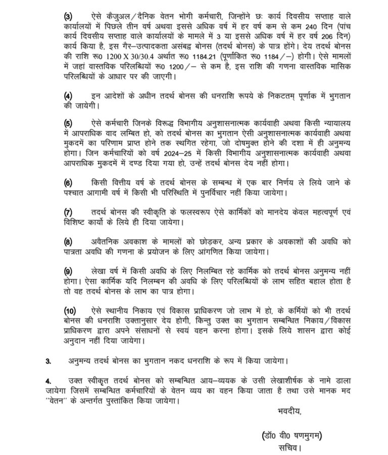 1. 31 मार्च 2025 तक सेवा में रहने वाले कर्मचारी, जिन्होंने 2024-25 के दौरान पूरे 12 महीने अथवा आंशिक अवधि तक सेवा दी है, उन्हें उनकी सेवा अवधि के अनुपात में बोनस दिया जाएगा।