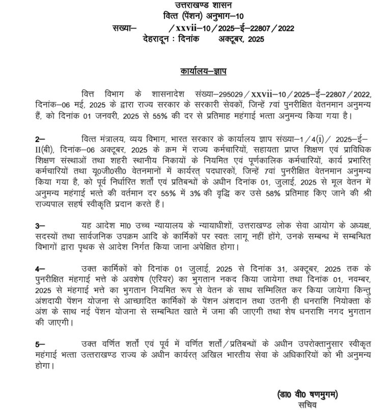 वित्त विभाग के शासनादेश (संख्या- XXVII-10/2025-ई-22807/2022) के अनुसार, यह निर्णय भारत सरकार के वित्त मंत्रालय के कार्यालय ज्ञापन दिनांक 6 अक्टूबर 2025 के क्रम में लिया गया है। केंद्र सरकार के कर्मचारियों के लिए महंगाई भत्ता 55% से 58% किए जाने के बाद, राज्य सरकार ने भी अपने कर्मचारियों को इसका लाभ देने का निर्णय लिया है।