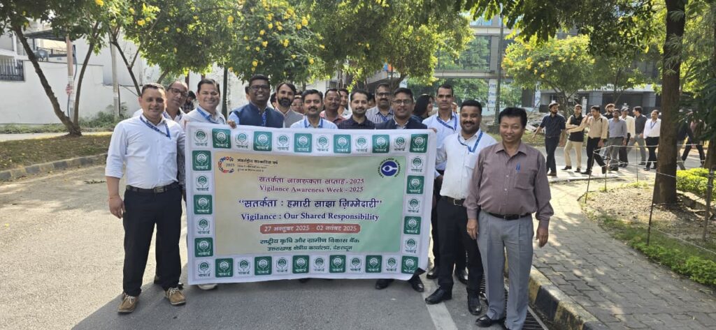 देहरादून, 31 अक्टूबर 2025 — नाबार्ड उत्तराखंड क्षेत्रीय कार्यालय, देहरादून द्वारा सतर्कता जागरूकता सप्ताह का आयोजन 26 अक्टूबर से 02 नवम्बर 2025 तक किया जा रहा है। यह सप्ताह राष्ट्रव्यापी अभियान के तहत ईमानदारी, पारदर्शिता और जवाबदेही को बढ़ावा देने के उद्देश्य से मनाया जा रहा है।